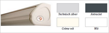 De cassette is standaard leverbaar in de kleuren technisch zilver, crème wit (RAL 9001), antraciet (RAL 7016) en wit (RAL 9010). Tegen meerprijs is elke gewenste RAL-kleur leverbaar. |